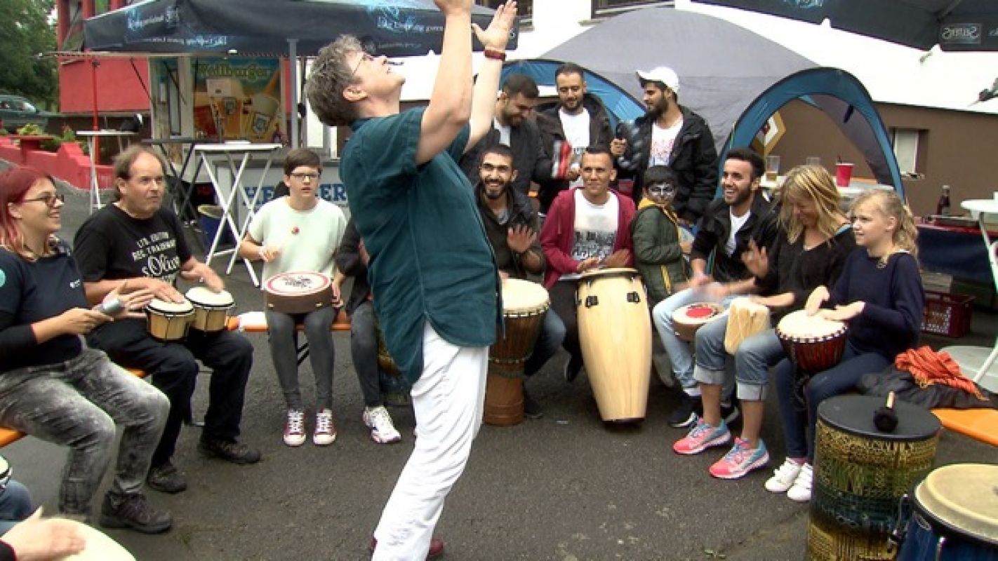 So gelang es ihr mit wenigen Handzeichen und einer ausdrucksstarken Mimik die trommelnde Gruppe mitzureißen und auf einen gemeinsamen Groove einzustimmen. Vom zart entflammenden Crescendo bis hin zum explodierenden Trommelwirbel - vom Säugling bis zum Senior- alle ließen sich ganz auf die harmonisierende und vitalisierende Wirkung der rhythmischen Schwingungen ein.